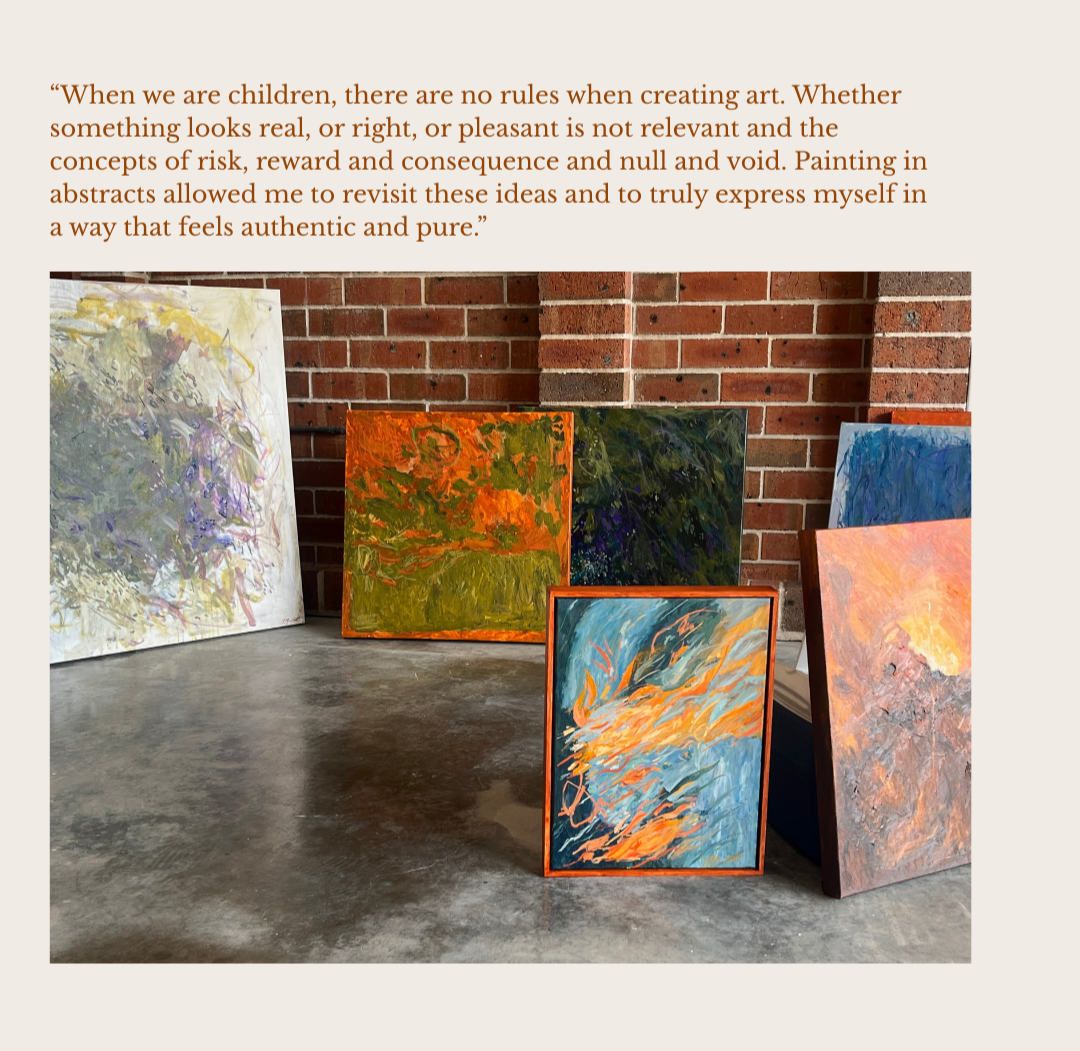 When we are children, there are no rules when creating art. Whether something looks real, or right, or pleasant is not relevant and the concepts of risk, reward and consequence and null and void. Painting in abstracts allowed me to revisit these ideas and to truly express myself in a way that feels authentic and pure.It is refreshing to invite play and experimentation into my practice, and when looking back now, this is the same principle I applied to creativity as a child.